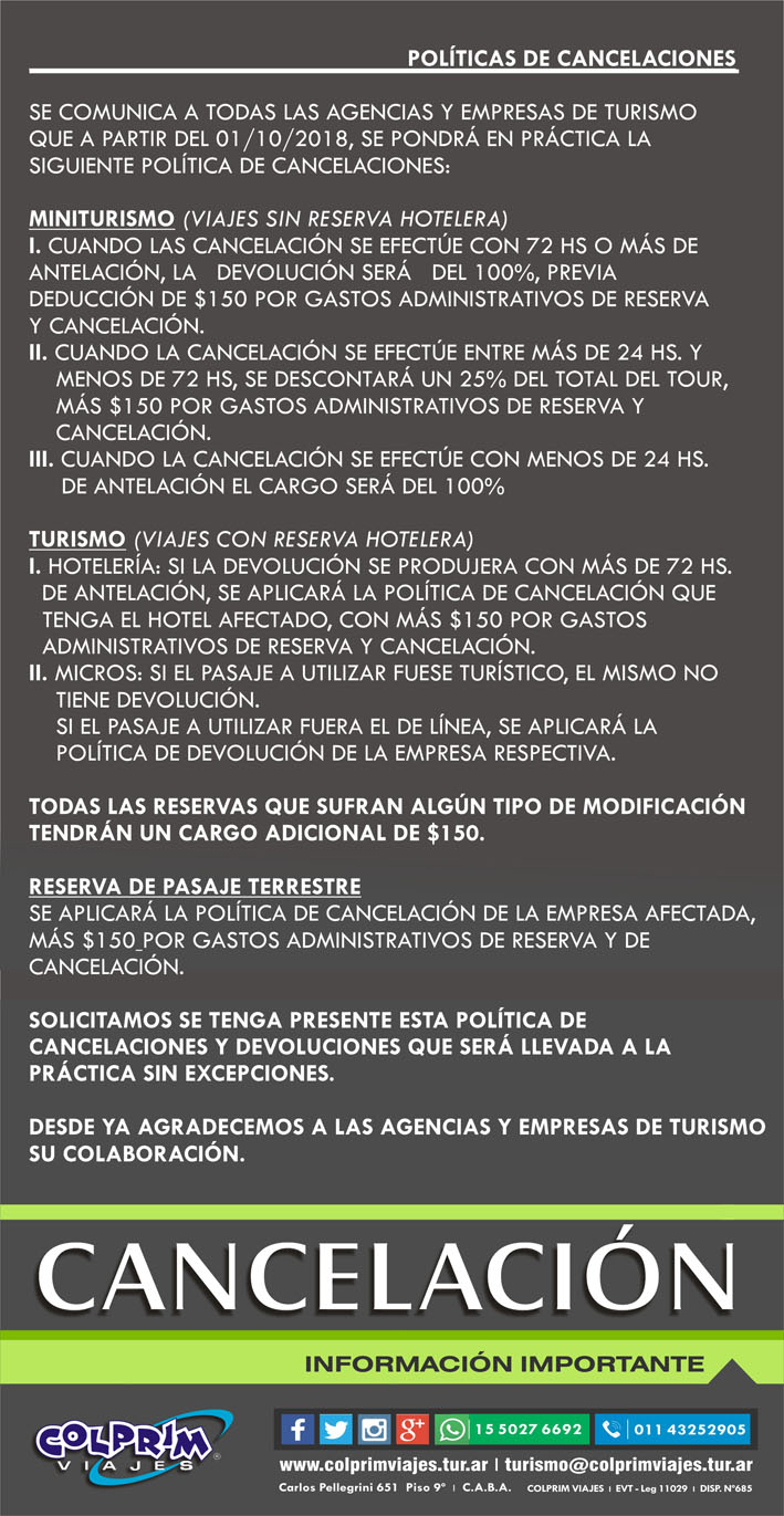 COLPRIM VIAJES Copyright 2007-2012 - Todos los derechos reservados | web design & hosting by southern cross networks EVT LEG. DNST 11029 DISP. Nº 685 - Resolución de Secretaría de Turismo de la Nación: 237/07 | 271/09 | CONDICIONES GENERALES |